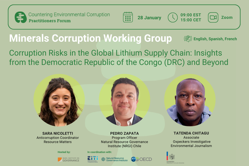 Speakers: Sara Nicoletti, Anticorruption Coordinator, Resource Matters, Pedro Zapata, Program Officer, Natural Resource Governance Institute (NRGI) Chile, and Tatenda Chitagu, Associate, Oxpeckers Investigative Environmental Journalism.